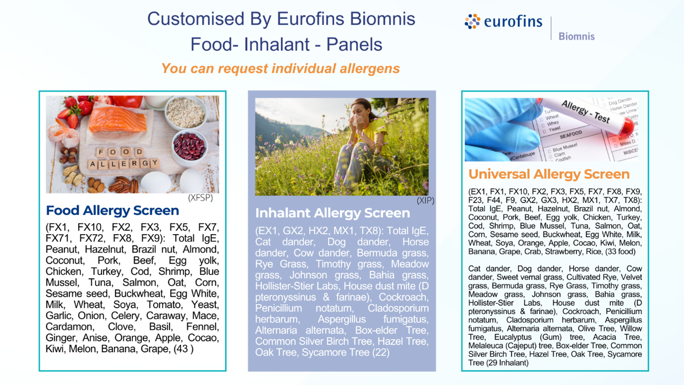 The bottom-up approach to allergy diagnosis is where the patient is screened by using a very large panel to identify allergens that are not suspected from questioning the patient or from a skin prick test. Eurofins Biomnis offer this test to GPs.